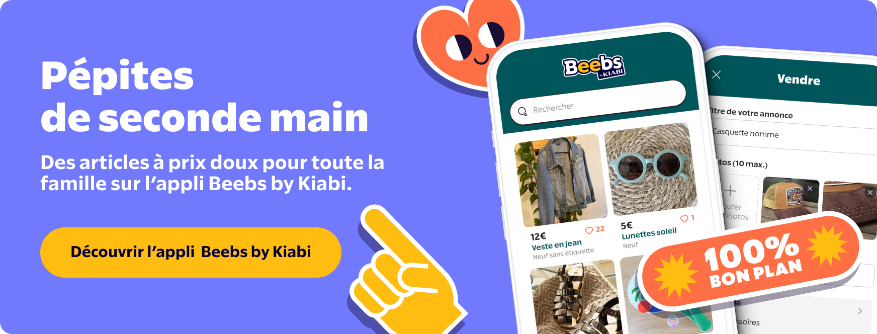 Beebs, c’est l’application de seconde main pour acheter et revendre des affaires pour toute la famille. Mode enfants, adultes, couches, déco, mobilier, jouets, livres, produits de soin… Plus de 6 millions de bonnes affaires d’occasion à des prix jusqu’à 80% moins chers qu’en magasin. Parfois même encore neuves, avec étiquette ! Et pour les achats comme la vente, c’est pas sorcier : tout est simple et sécurisé.