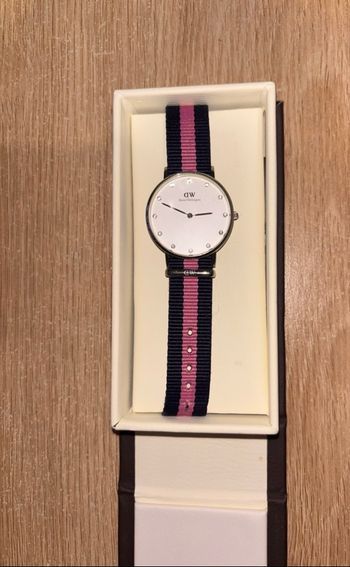 Montre Daniel Wellington Classy Winchester 34mm avec bracelet NATO bleu marine et bande rose.