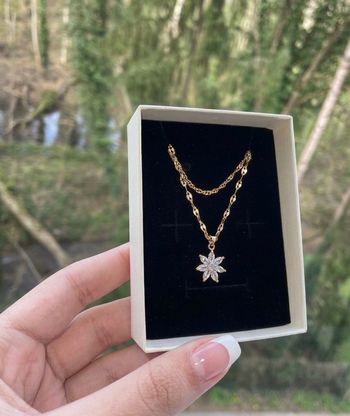 Collier double avec chaîne acier inoxydable doré et fleurs cristal avec boîte cadeau