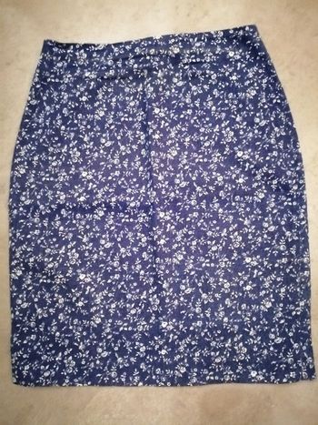 Jupe droite en jean extensible marine et fleurs blanches Longueur 50 cm Taille 38 NINA KALIO Neuve