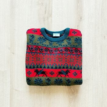 Vintage Héraldique Pull Rouge et Vert Homme Exclusive en très bon état (Taille M)