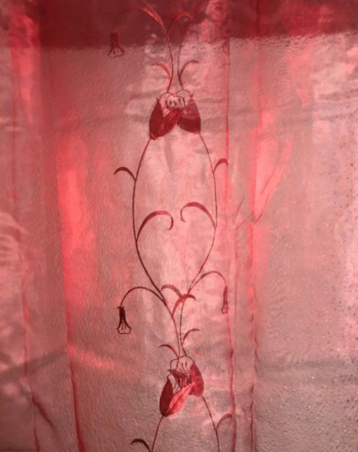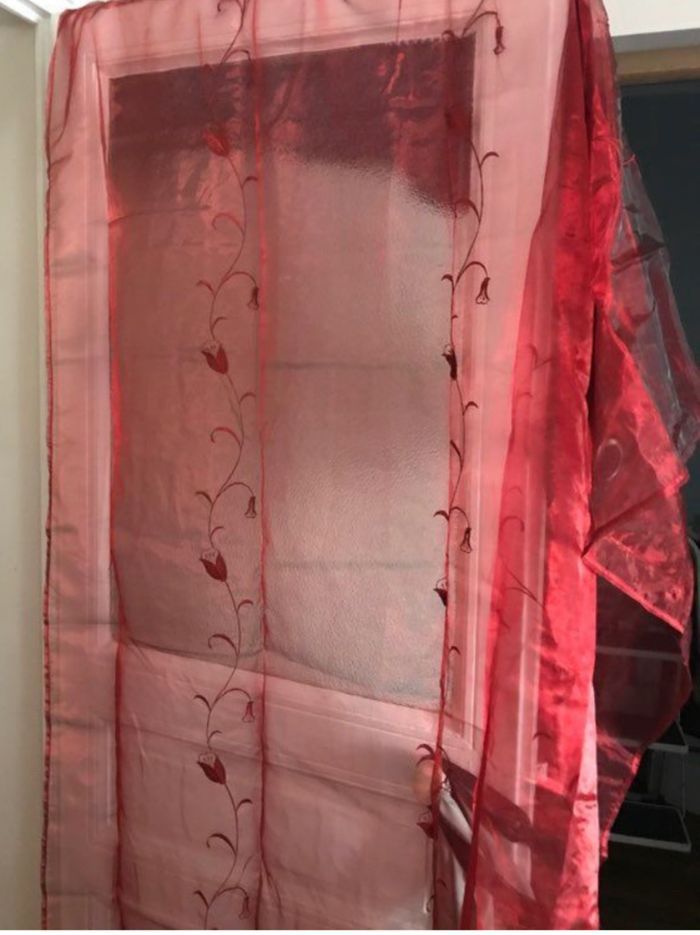 Magnifique paire de voilages en organza bordeaux, neufs. Composée de deux rideaux identiques, cette paire apporte une touche élégante et lumineuse à votre intérieur tout en préservant l’intimité. Le tissu est un organza léger, transparent et fluide, avec un joli brillant naturel. La couleur est un bordeaux profond et intense qui prend de beaux reflets selon la lumière. Chaque panneau est orné d’une broderie délicate représentant des branches fines et grimpantes avec de petits boutons de fleurs en relief dans un ton plus foncé. La bande supérieure est renforcée en organza opaque de la même couleur, et les rideaux sont équipés d’œillets métalliques argentés pour une installation facile sur tringle. Les ourlets sont soignés pour un tombé parfait. Chaque rideau mesure environ 140 cm de largeur sur 250 cm de hauteur, dimensions standards prêt à poser. Vendu par paire. Ce voilage convient parfaitement pour un salon, une chambre ou une porte-fenêtre : il laisse passer la lumière tout en créant une ambiance chaleureuse et raffinée. État neuf, jamais