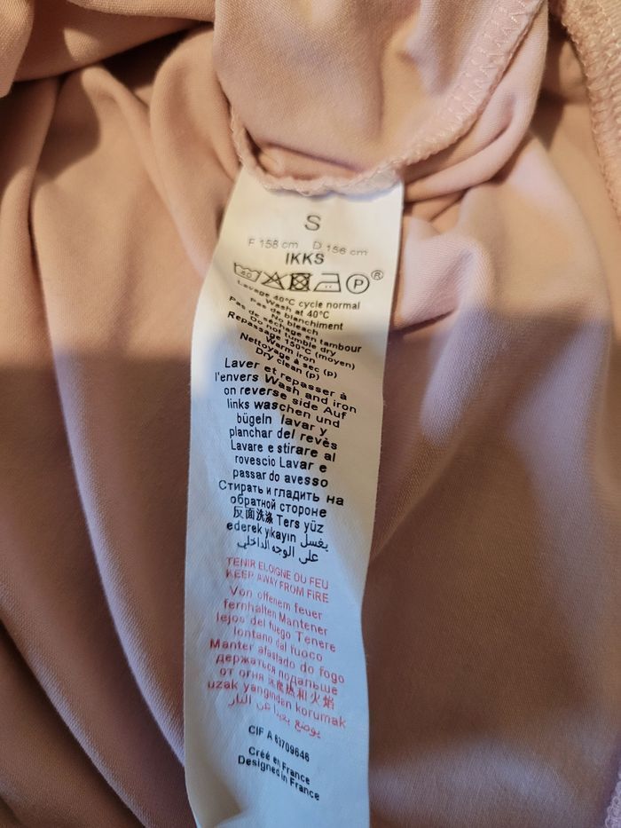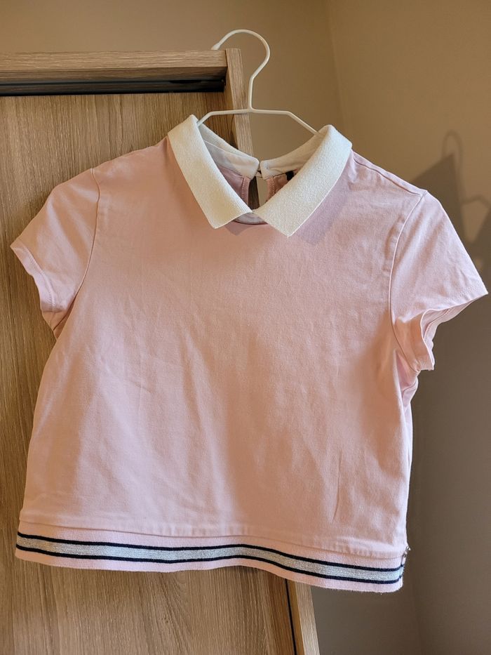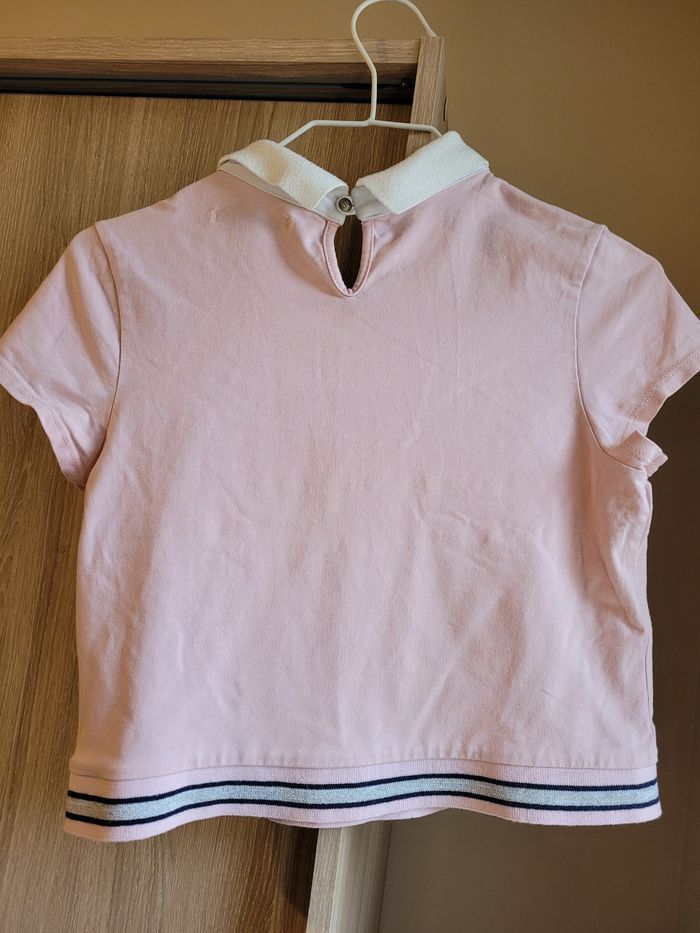 Polo rose avec col blanc. Longueur 40 cms. 93 % coton et 7 % elasthanne. Largeur épaule à épaule 33 cms IKKS