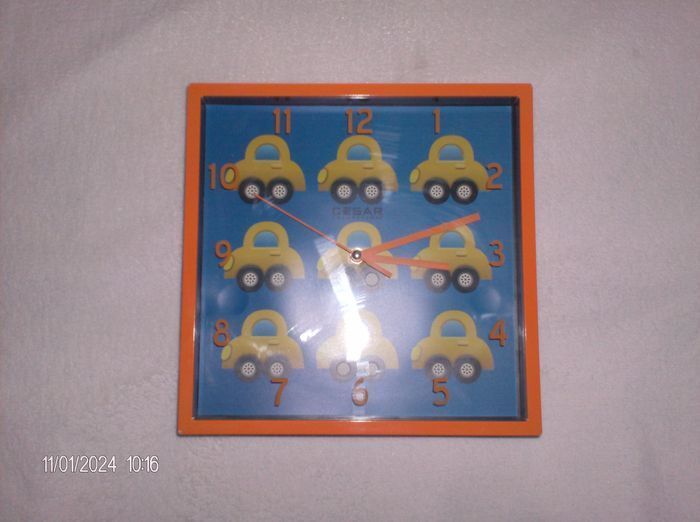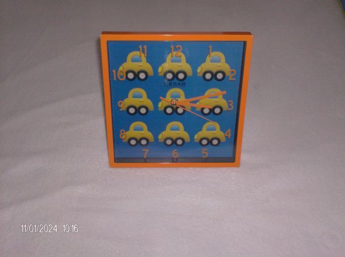 Horloge murale pour enfant. Horloge à quartz qui fonctionne avec une pile AA (fournie). Marque César. Dimensions 24 x 24. Très bon état et nettoyée. Envoi rapide par Mondial Relay ou Relais Colis ou remis à Paris 13ème.