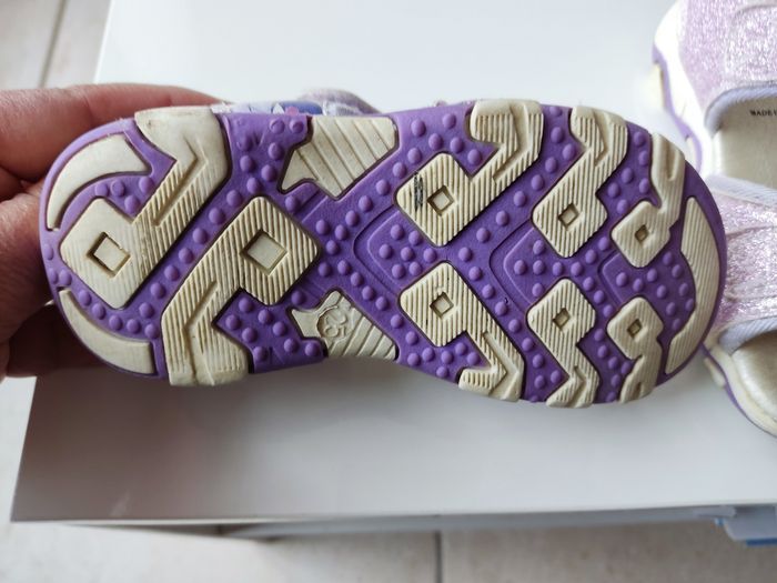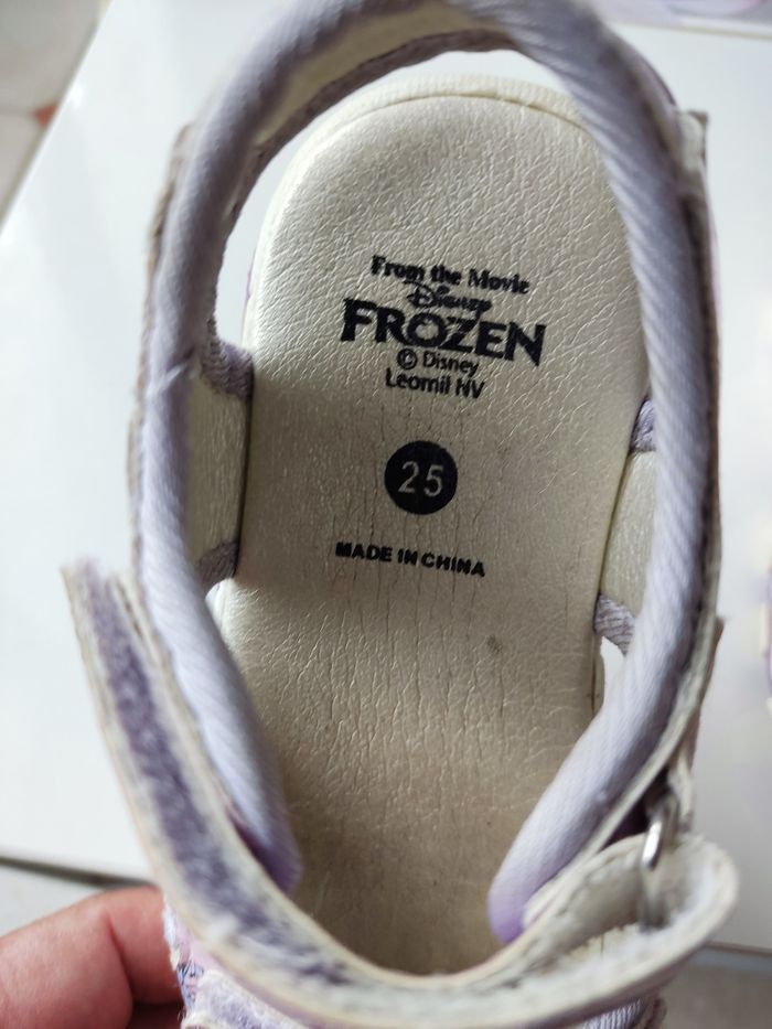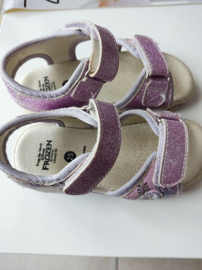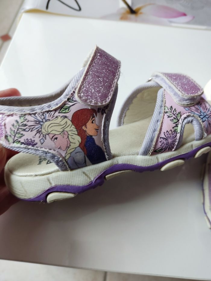 Sandales en parfait état, de la marque Gémo. Elles se ferment avec un scratch. Elles ont Elsa et Anna dessinées dessus et elles sont roses à paillettes.