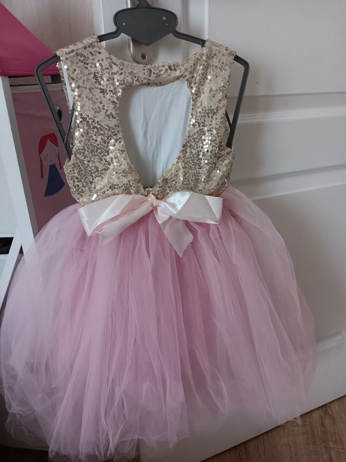 Robe princesse taille environ 2 ans. Mis une fois pour une séance photo. Rose à tulle avec paillette doré. Très bon état