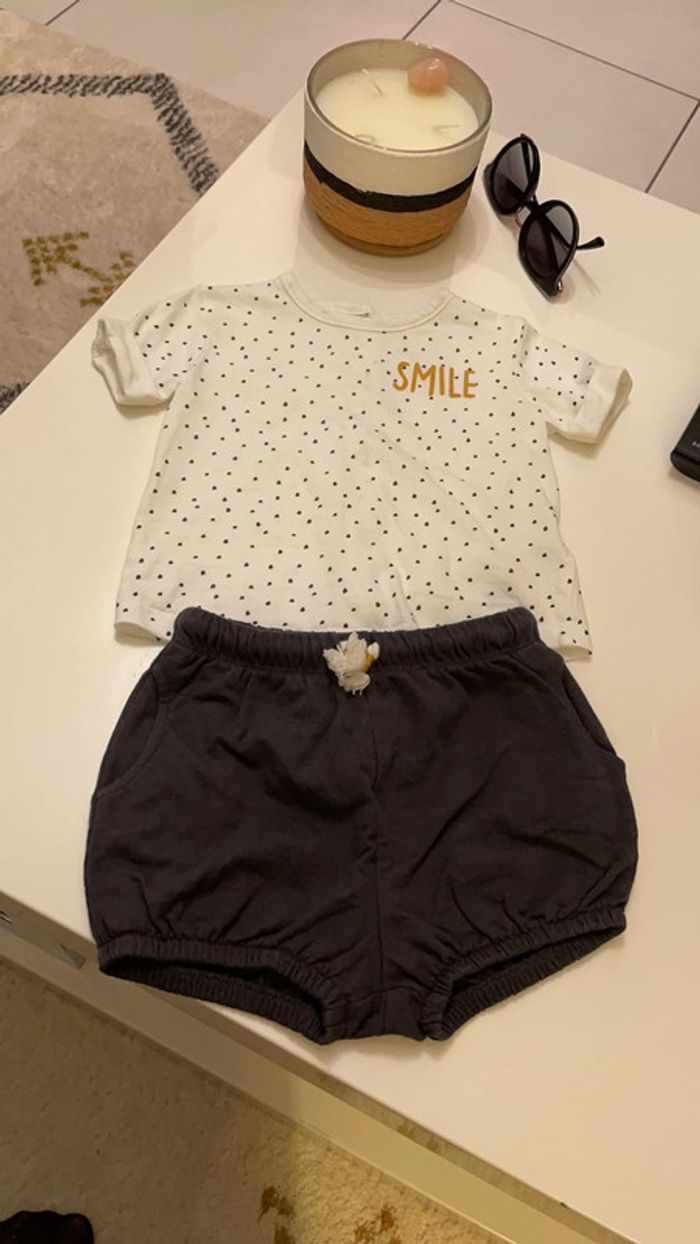 tenue tee-shirt short le short est gris foncé avec lien blanc et doré 9 mois #tenuefille #bebe9mois #bebepup9mois #tenuegarcon