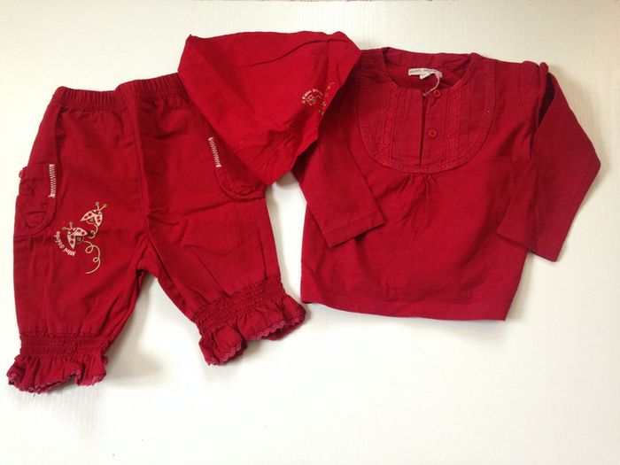 pantacourt (plutôt) froncé en bas foulard et petit pull ou chemise il manque l'attache pour les boutons, je peux le réparer (et sinon je baisse le prix de 0.50 pour la couturière) après je sais pas si vraiment l'attache est utile (je m'en rappelle plus) #troc38420_24moisfille