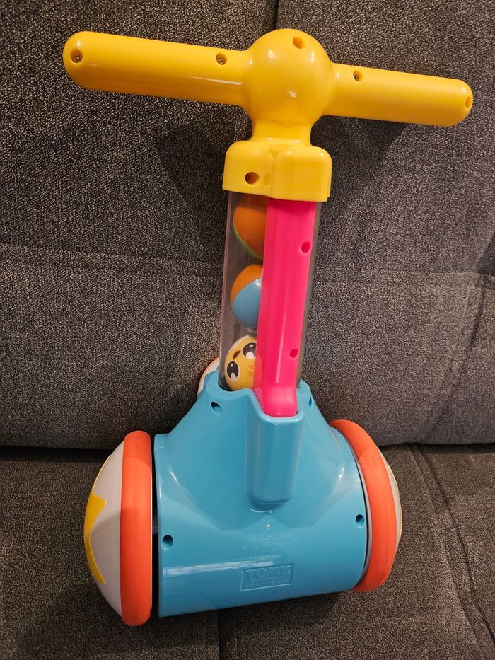 Jouet mon fun trottinette de la marque Tomy. Comme neuf avec ses 4 balles. Inscription tomy sur le devant un peu effacée (lettre O et M) Lance et ramasse les petites balles.