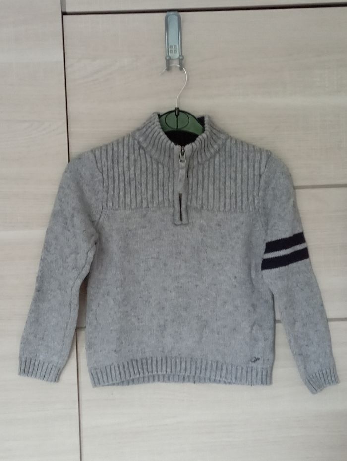 Bonjour, je vends un pull polaire avec col pour les garçons en bon état, sans marque, de couleur grise (80% de coton et 20% de laine).