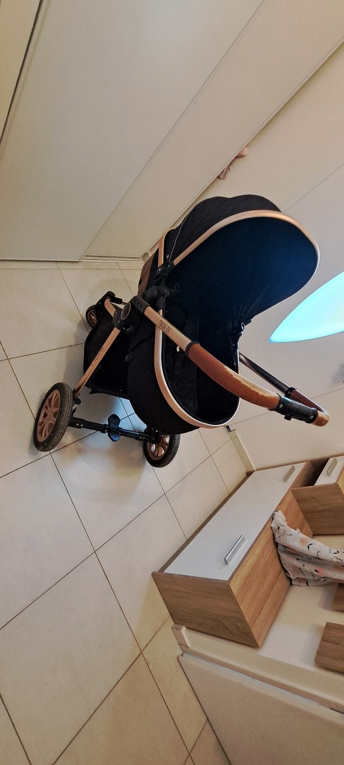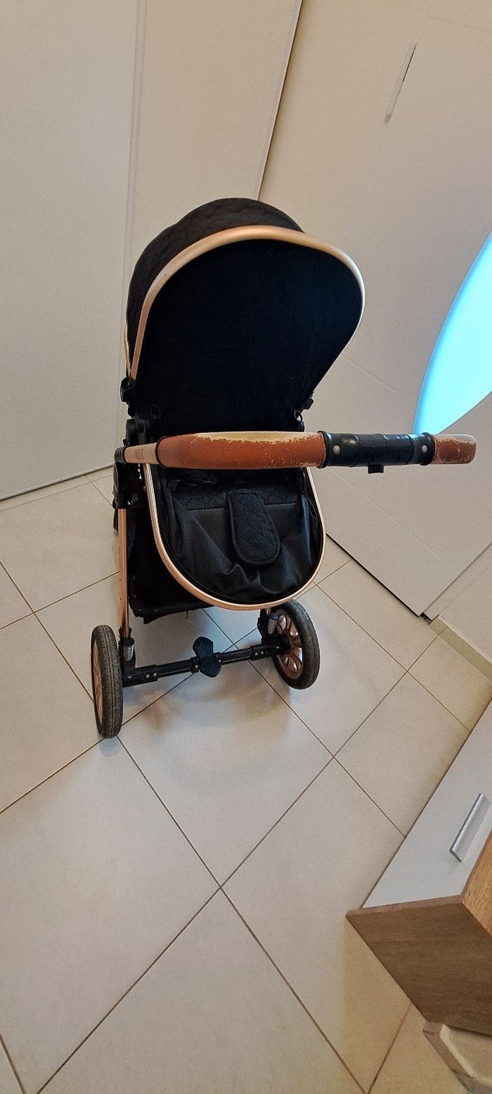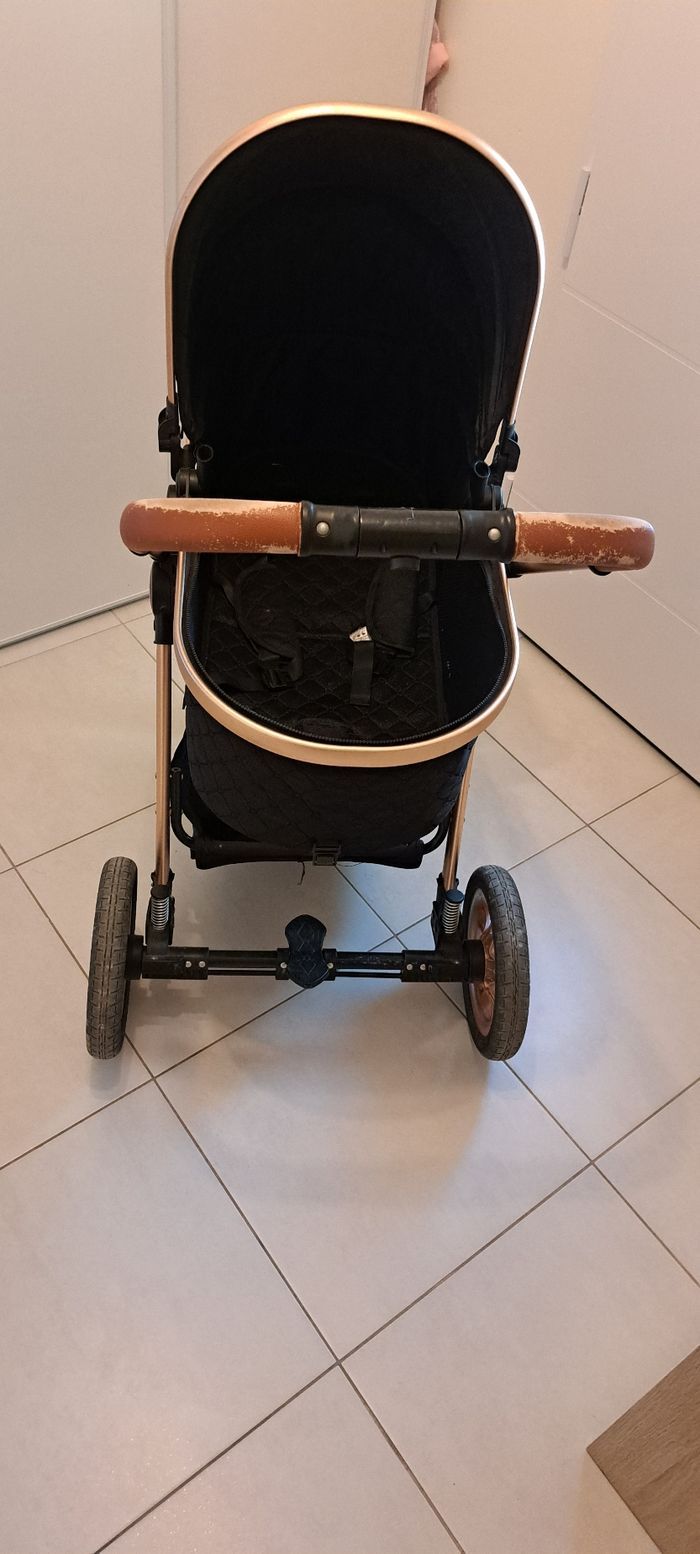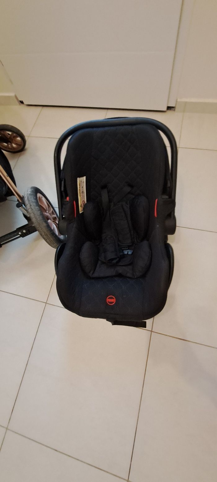 Poussette trio avec cosy et la nacelle se transforme en assise. Le simili cuir est abîmé des le début au niveau de la poignée.