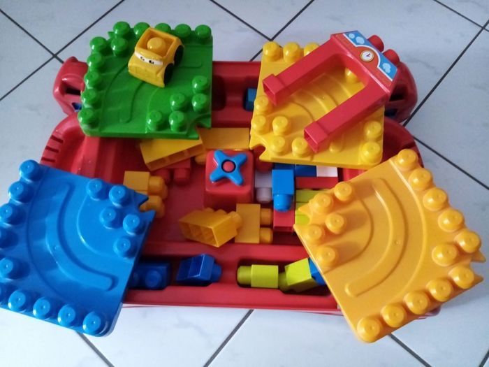 Table méga block avec des blocks. Facile à plier et déplier. Elle peut se ranger facilement dans un coin ou sous un lit.