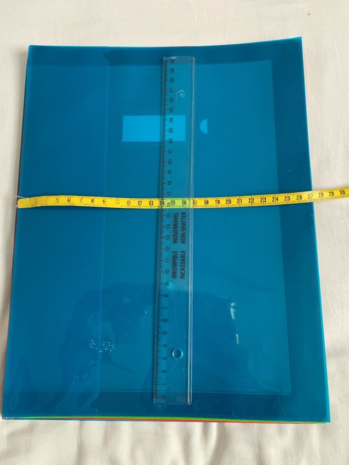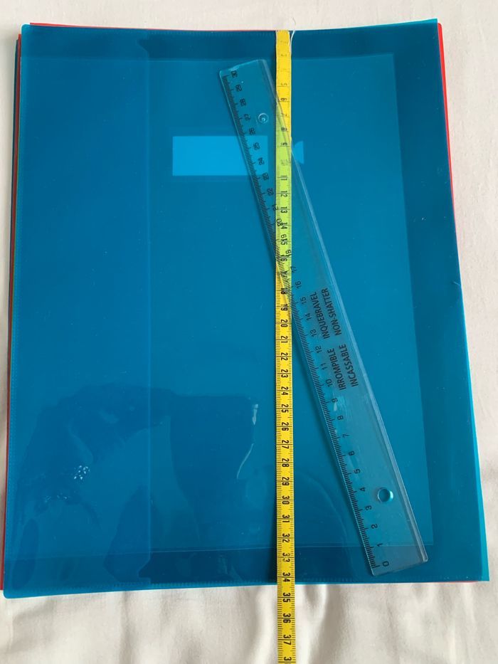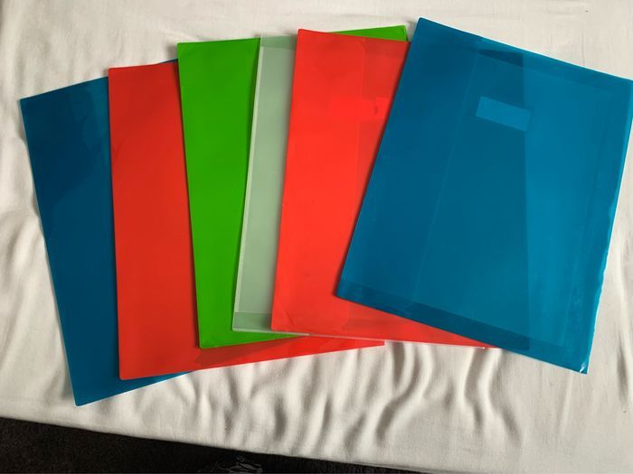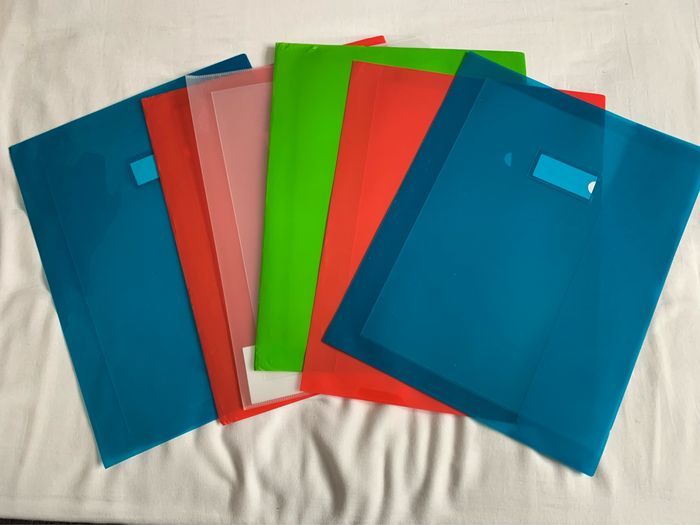 6 Protèges grands cahiers en plastique, 2 bleus, 2 rouges, 1 transparent et 1 vert, le vert est légèrement marqué en haut sinon les autres sont comme neufs