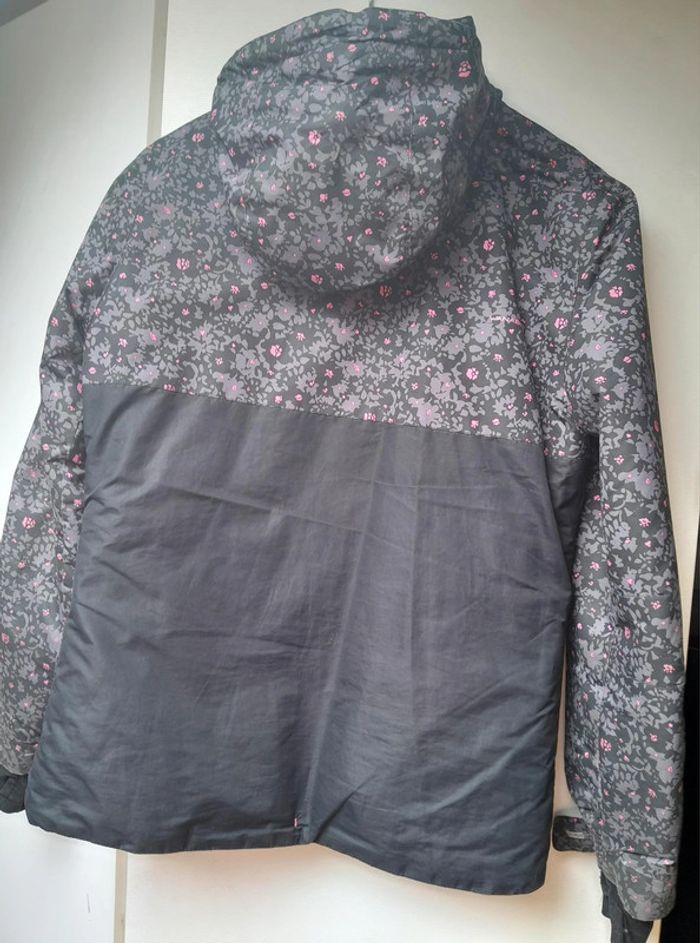 Hauteur : 63 cm tour d'épaules : 86 cm, tour de poitrine : 102 cm, Capuche non-dégrafable et resserable par des crochets en plastique, doublure sertie de fleurs grise : (voir photo 2), Fermeture éclaire au centre et sur les poches : (voir photo 3), sratchs sur chaque poignets réglables + une option pour insérer le pousse à l'intérieur : (voir photo 4), crochets en plastique de chaque côté : pour resserrer le blouson dans le bas, matière : polyester.
