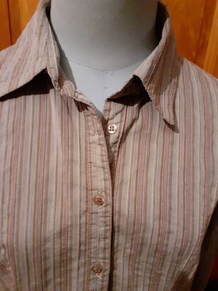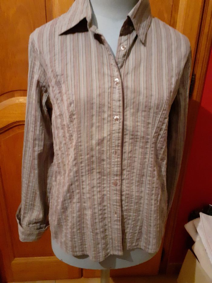 Chemisier gris à fines rayures marron, blanc, bleu. Cintré Manque étiquette , taille 38/40 Manches avec revers