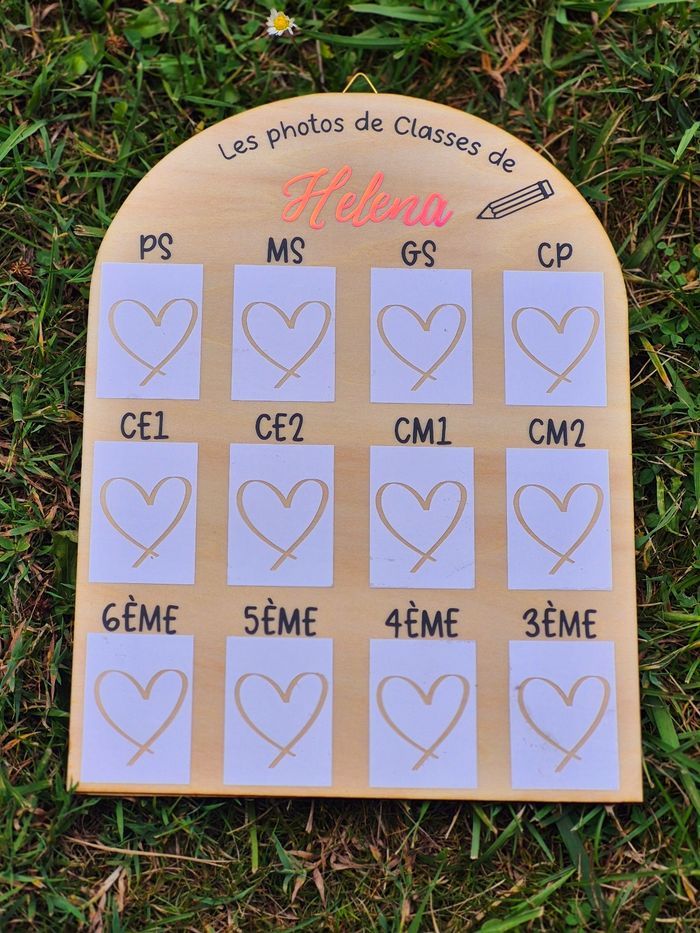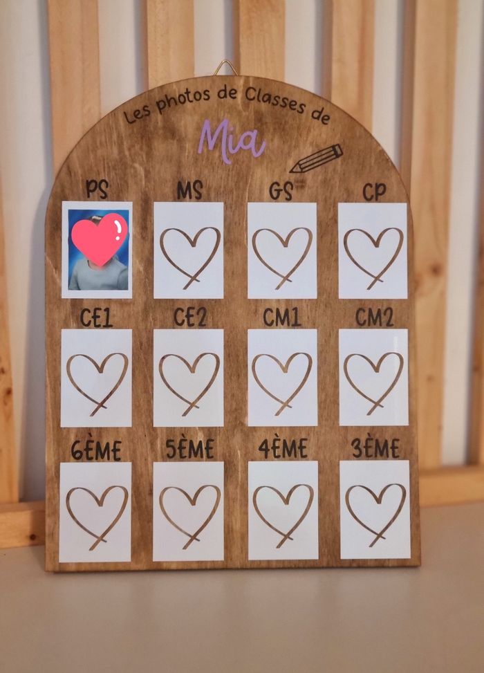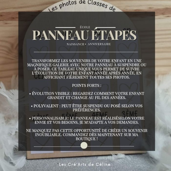 Découvrez le tout nouveau panneau photo ! Transformez les souvenirs scolaires de votre enfant en une magnifique galerie avec notre panneau à suspendre ou à poser. Ce tableau unique vous permet de suivre l’évolution de votre enfant année après année, en affichant fièrement toutes ses photos d’école. Points forts : • Évolution visible : Regardez comment votre enfant grandit et change au fil des années. • Polyvalent : Peut être suspendu ou posé selon vos préférences. • Spécial bébé : Disponible aussi avec les mois de la première année de bébé pour capturer chaque précieux moment. Ne manquez pas cette opportunité de créer un souvenir inoubliable. Commandez dès maintenant sur ma boutique !