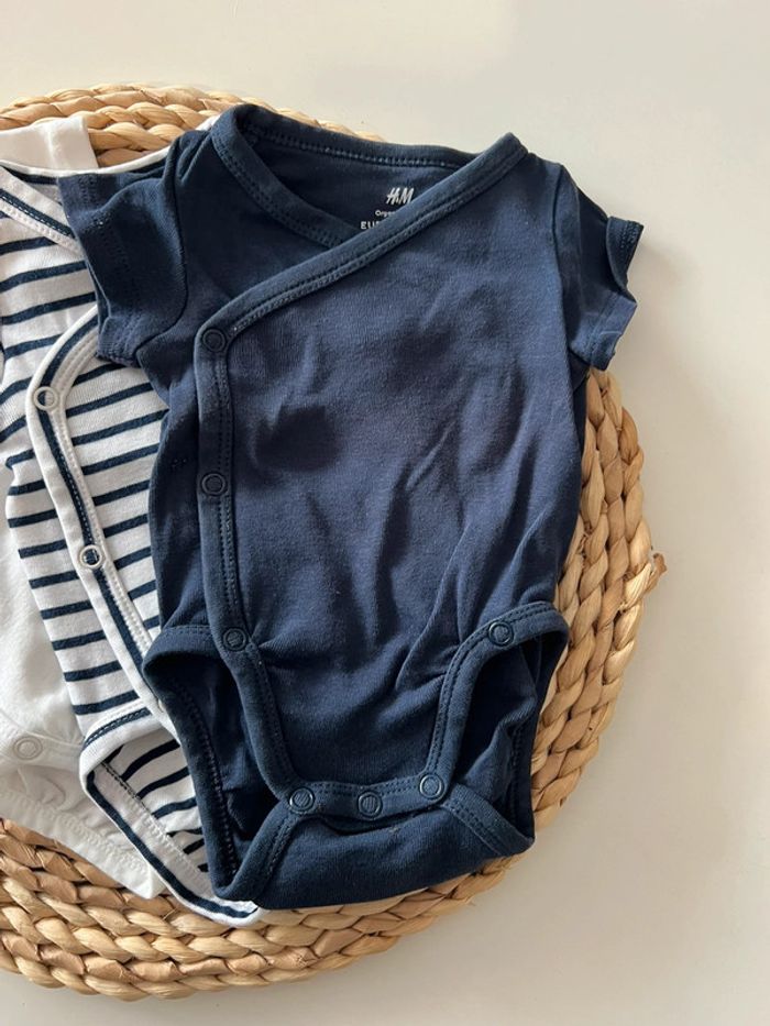 Lots de 3 bodies manche courte naissance taille 50 cm Porter 3 fois le bleu les autres sont neufs juste lavés Comme neuf #bodies#bodiemanchescourtes#bébé#H&M#naissance