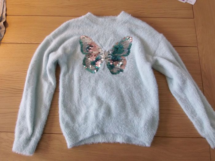 Pull vert en maille duveteuse avec sequins magiques papillon Gémo 8 ans #marie62lfille8ans