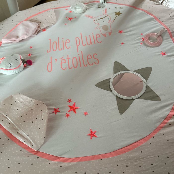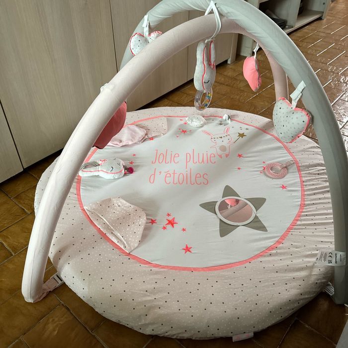 Jolie tapis d’éveil en très bon état peu servi Jouet d’éveil amovible, sur le tapis : un miroir, un anneau de dentition, un lapin musical, une étoile vibrante, et du papier crissant. Sur l’arche : un hochet lapin, 2 cœur avec clochette et 2 nuage avec pouet-pouet