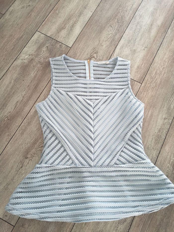 Haut bleu clair moulant et évasé sur le bas avec des effets de transparence. Noté taille L mais taille comme un M Mondial relay