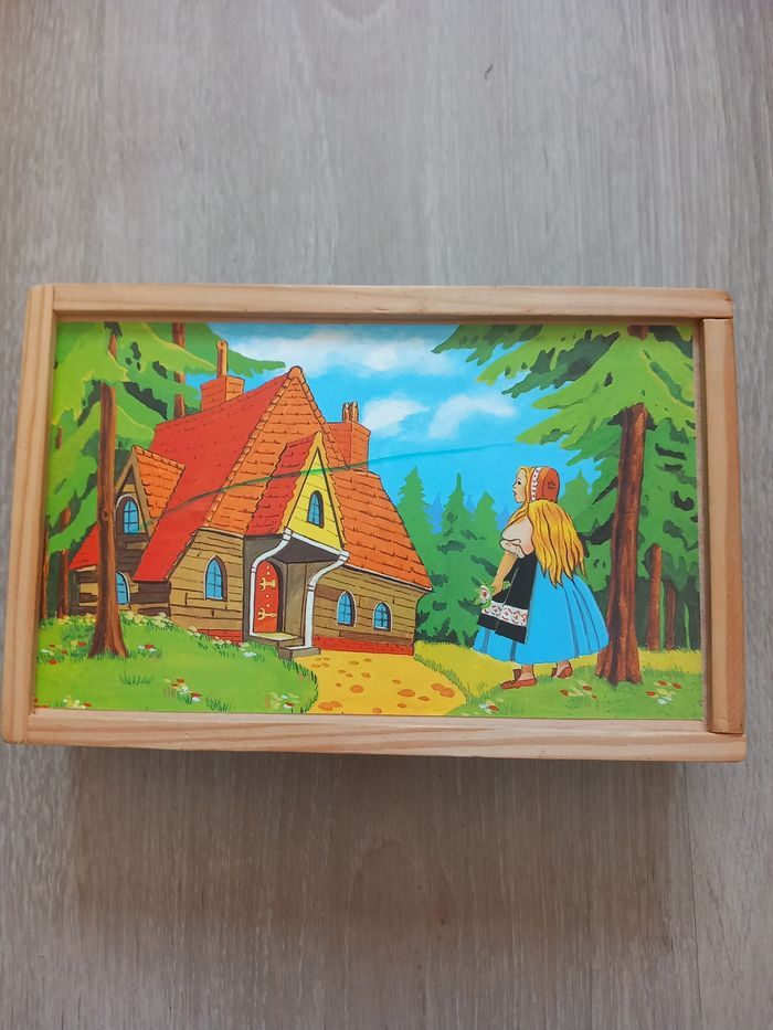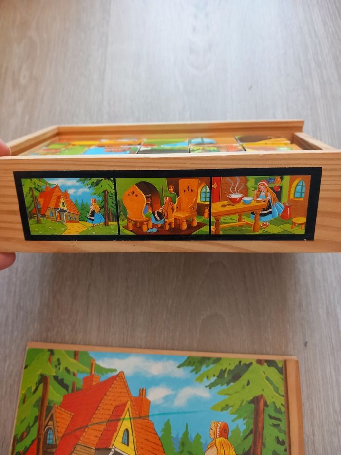 Puzzles cubes vintage dans caisse en bois. En bon état