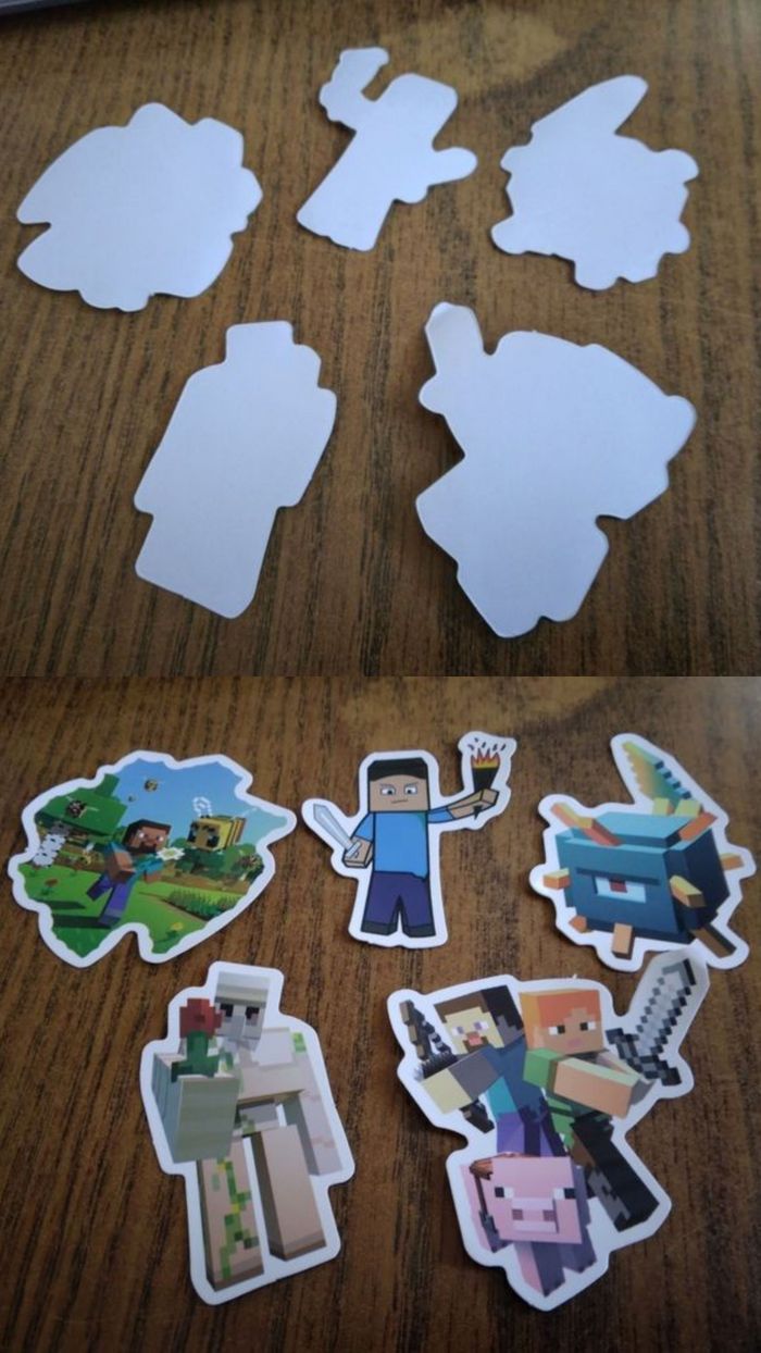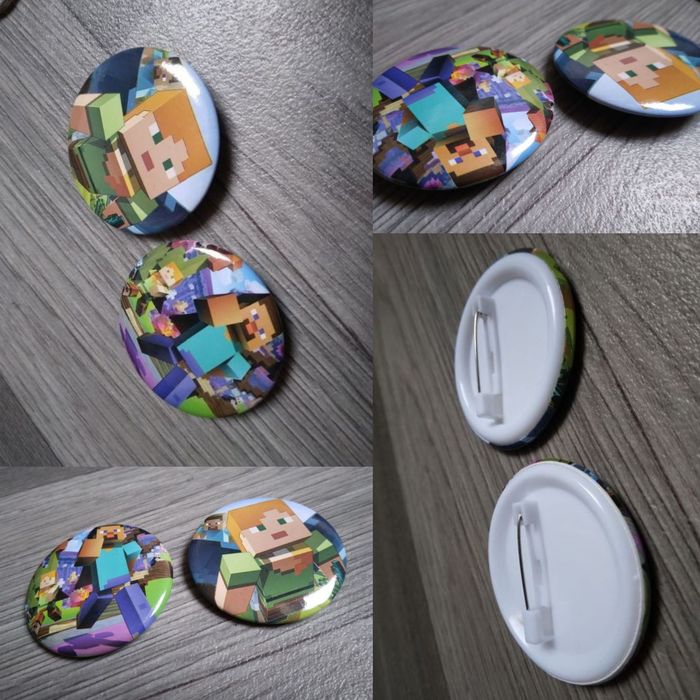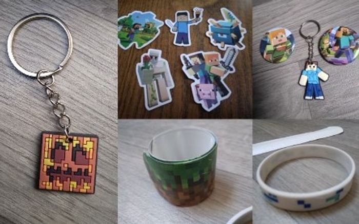 Lot minecraft, neuf non utiliser - 2 badges - 1 porte clé - 5 autocollants minecraf - 1 bracelet - 1 règle clap bracelet ( petit défaut d'impression) - Porte clé minecraft orange , comme neuf non utiliser