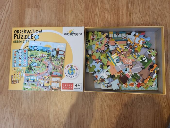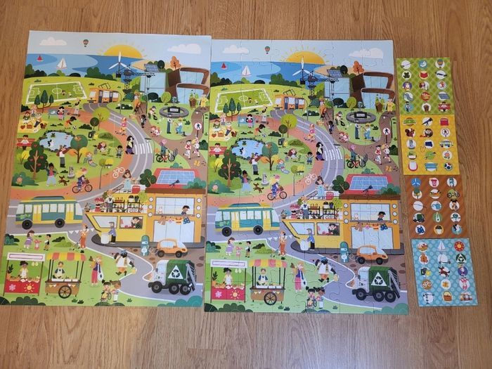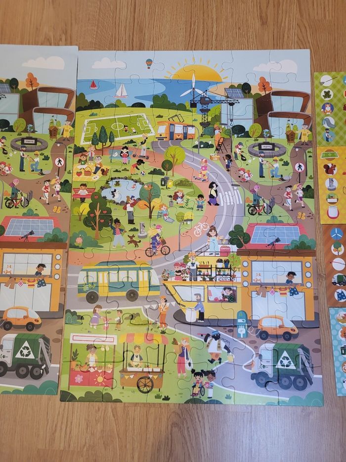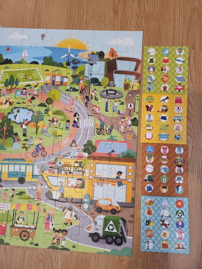 Bonsoir Je vends un puzzle adapté aux enfants de 4 ans sur le thème de l'écologie. On peut aussi retrouver les différents objets du puzzle. Il est en très bon état. Je le vends 3€.