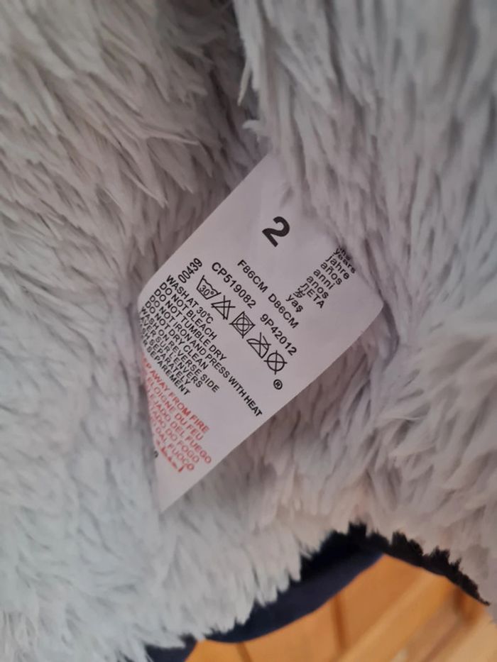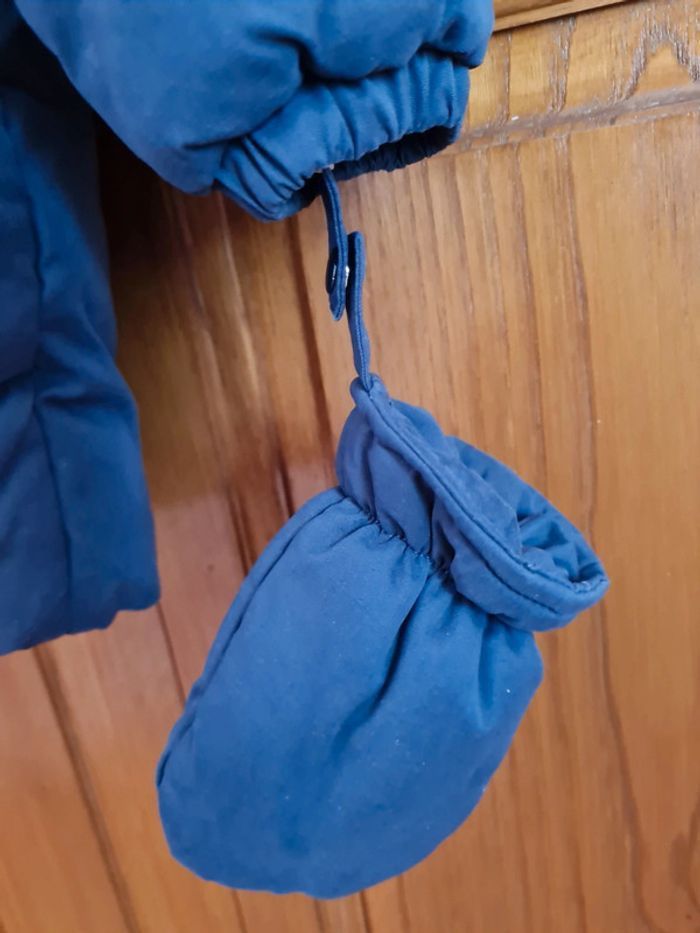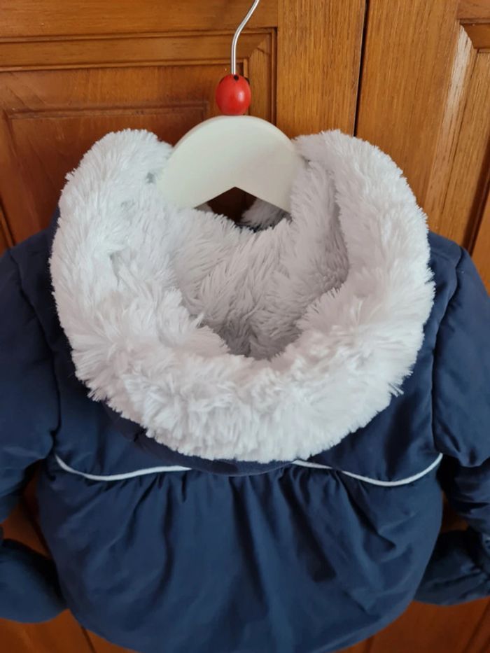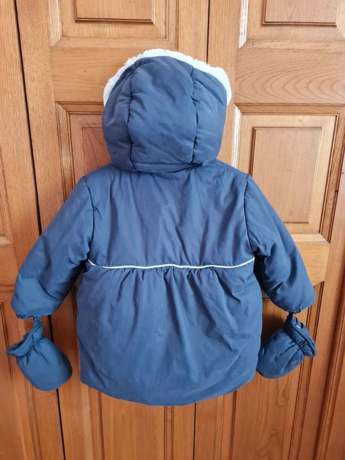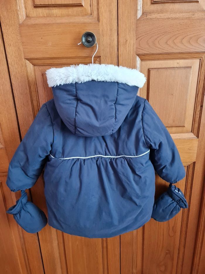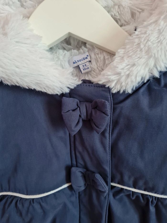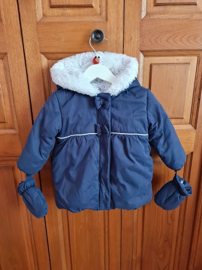 Manteau chaud avec capuche bleu marine et liseré blanc à la taille, avec deux nœuds, intérieur de la doudoune blanc. + moufles bleu marine détachables par un bouton pression. Fermeture par fermeture éclaire cachée + 2 boutons pressions. En taille 24 mois/2 ans de la marque Absorba. Pas de tâche ni de trou, en parfait état. #pau2416vetements24mois