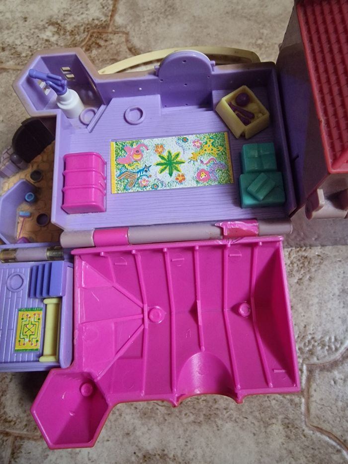 Maison polly pocket, les piles sont restées longtemps dedans donc un peu oxydé mais les lumières fonctionnent par moment et qu à certains endroits. Petite partie du toit cassé sur l ouverture (voir photo) mais ne change en rien la fonctionnalité. Porte garage qui s ouvre avec un peu de mal mais s ouvre et se ferme..Avec un personnage bras cassé. Vendu comme photo