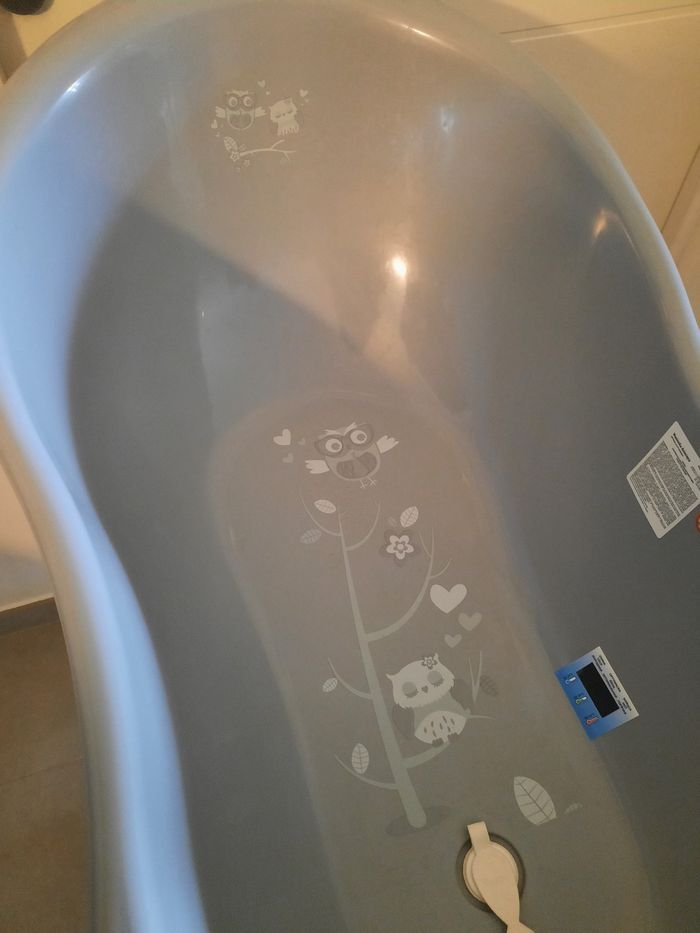 Bonjour, Vends baignoire grise sur pieds avec transat et motifs hiboux. Les pieds peuvent être retirés et pliés et le transat se fixe dans la baignoire grâce à des ventouses. Le dessin du transat s'est effacé par endroit et les pieds ont quelques petites traces sur le métal mais sinon l'ensemble est encore en bon voir très bon état. La baignoire a également un stickers qui indique la température de l'eau. Convient dès la naissance /!\ Remise en main propre (Marseille, La Penne sur Huveaune, Aubagne et alentours) uniquement pour ce produit car ses dimensions ne permettent pas un envoi. Merci de votre compréhension Pour toutes questions n'hésitez pas à me contacter