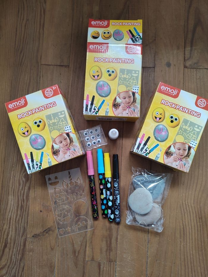 Lot de 3 boîtes de galets sur lesquels on peut dessiner. Boîtes neuves, juste une ouverte pour la photo. Possibilité de diviser le lot.