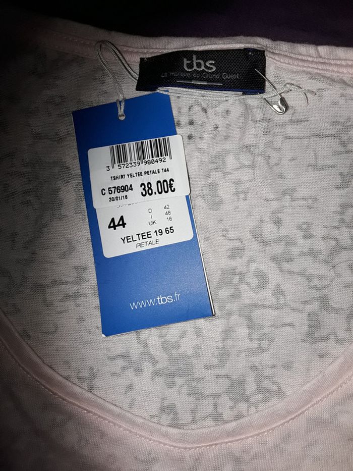 T-shirt NEUF, jamais porté avec étiquette, acheté à Truffaut. Marque tbs, taille 44. Valeur 38€