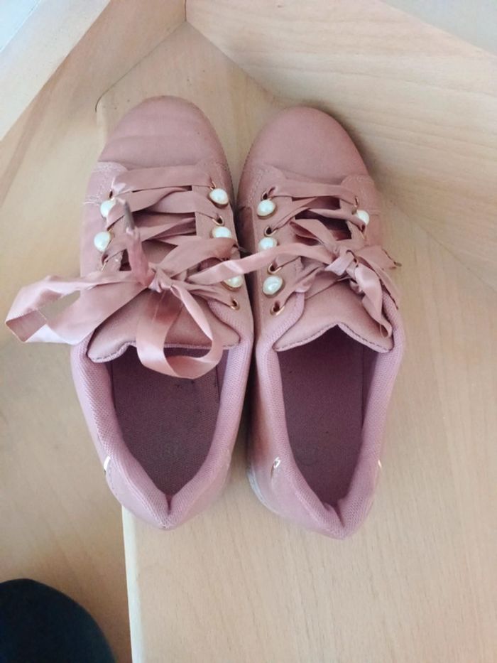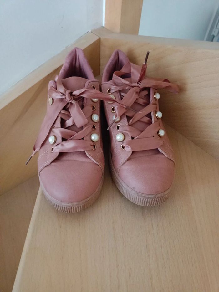 Baskets acheté chez Stand privé. Pointure 37, coloris vieux rose. Détail couleur or à l'arrière et perles sur l'avant. Manque une perle (voir photo). Très peu porté. #ccj1367femme