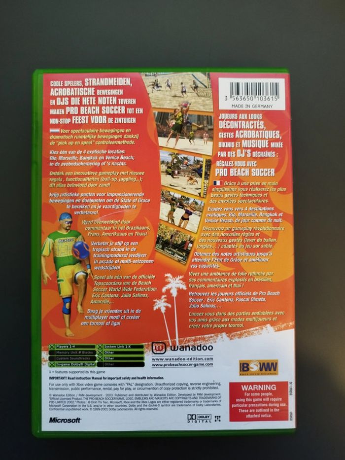 Pro Beach Soccer XBOX Très bon état. Vendu comme sur les photos. Envoi sous 24h sauf les dimanches et jours fériés si achat réalisé avant 20h. (Mondial Relay, Bpost, UPS) Pour les envois Homerr, envoi uniquement du lundi au vendredi.