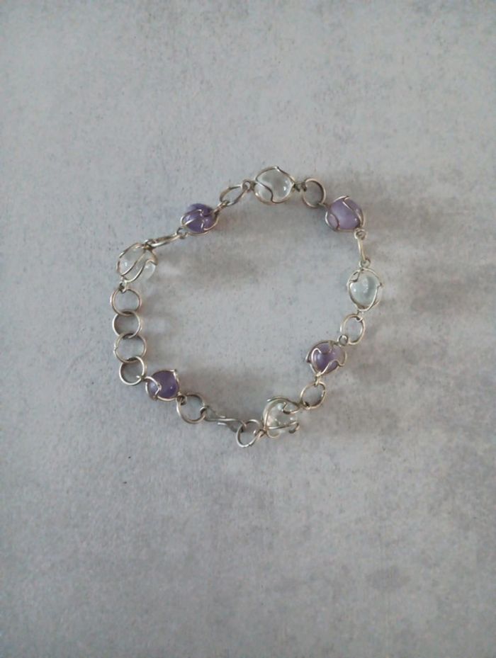 Bracelet fait main avec des perles violettes et blanches transparente.