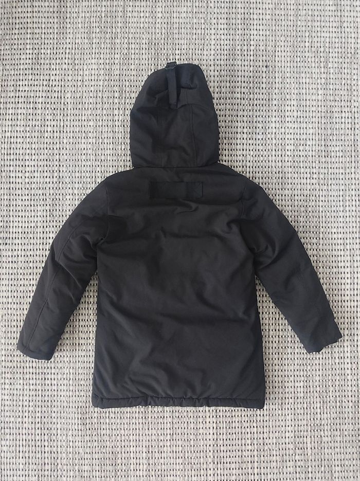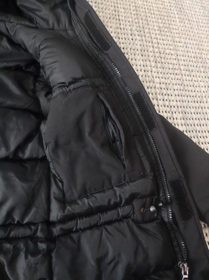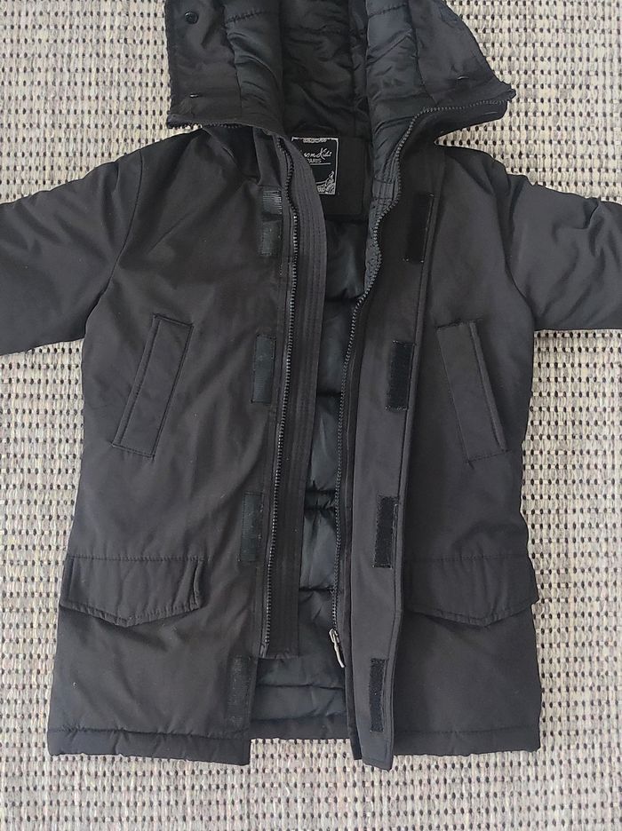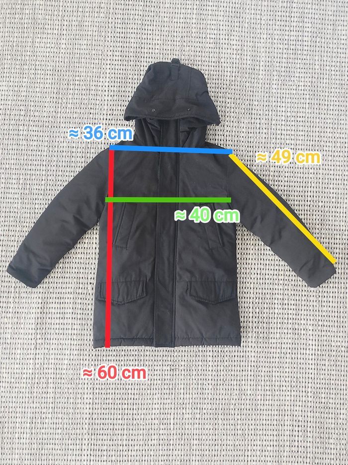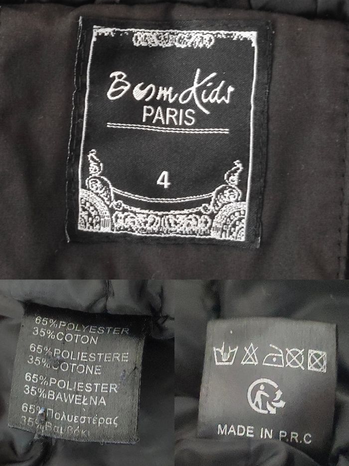 📏 𝗧𝗮𝗶𝗹𝗹𝗲 : Affiché taille 4 mais correspond plutôt à du 8 ans (voir mesure) 🏷️ 𝗠𝗮𝗿𝗾𝘂𝗲 : Boom Kids 🎨 𝗖𝗼𝗹𝗼𝗿𝗶𝘀 : Noir 🏁 𝗧𝗵𝗲̀𝗺𝗲 / 𝗠𝗼𝘁𝗶𝗳 : Uni 🧵 𝗖𝗼𝗺𝗽𝗼𝘀𝗶𝘁𝗶𝗼𝗻 : 100% Polyester 🌍 𝗣𝗮𝘆𝘀 𝗱𝗲 𝗙𝗮𝗯𝗿𝗶𝗰𝗮𝘁𝗶𝗼𝗻 : Chine 🇨🇳 ❌ 𝗗𝗲́𝗳𝗮𝘂𝘁(𝘀) : A l'origine il y avait de la fausse fourrure autour de la capuche mais il n'y en a plus 📜 𝗗𝗲́𝘁𝗮𝗶𝗹𝘀 𝘀𝘂𝗽𝗽𝗹𝗲́𝗺𝗲𝗻𝘁𝗮𝗶𝗿𝗲𝘀 : Veste coupe-vent mixte / unisexe, avec plusieurs poches et capuche. Manteau chaud pour l'hiver. Possibilité de le resserrer à la taille