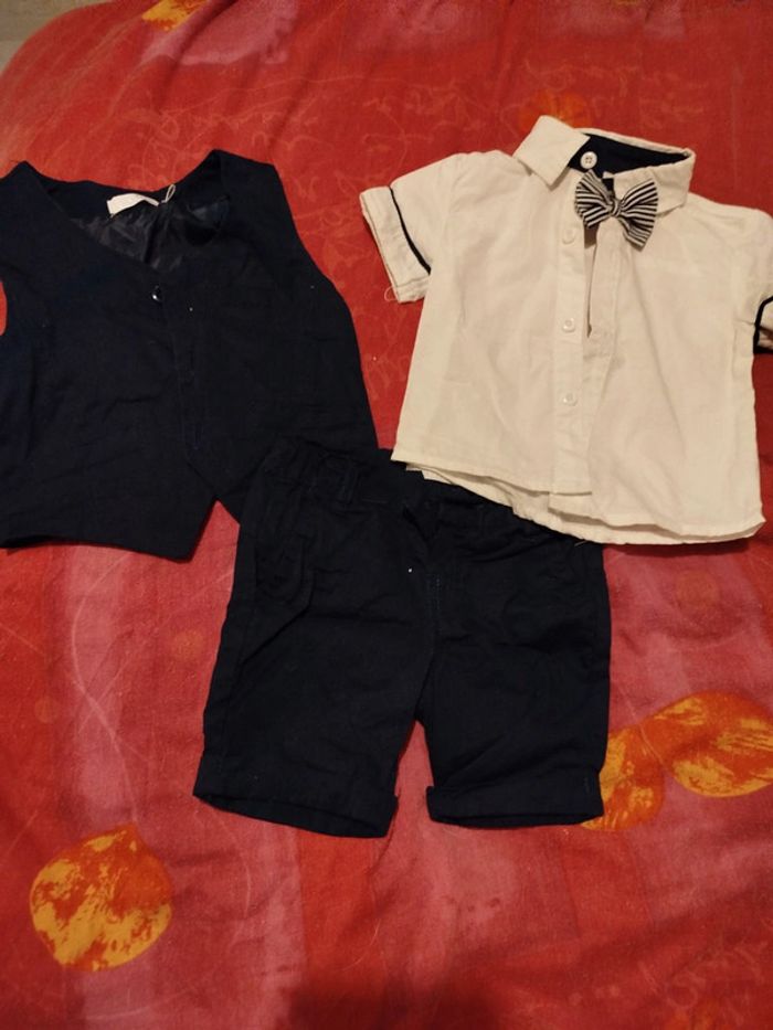 Très beau petit costume pour bébé composé d'un short d'une petite chemise avec nœud papillon intégré et d'un petit veston à bouton très peu porté, parfait état