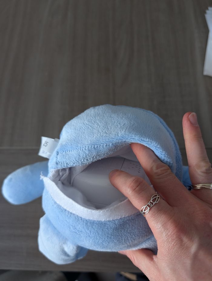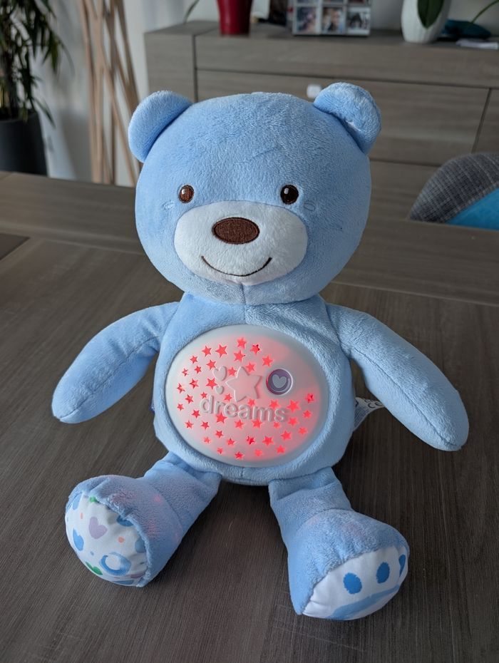 Neuf jamais utilisé, juste ouvert et malheureusement jeté la boîte. Plus de photos sur demande. Ourson avec projecteur avec des effets lumineux et des mélodies relaxantes L'éclairage change de couleur : La lumière change automatiquement de couleur 30 minutes de musique. Le bouton permet de changer de musique. Le boîtier situé dans l'ours permet de sélectionner soit la projection lumineuse uniquement, soit la lumière+mélodies. Il facilement lavable en machine grâce à son compartiment électronique amovible