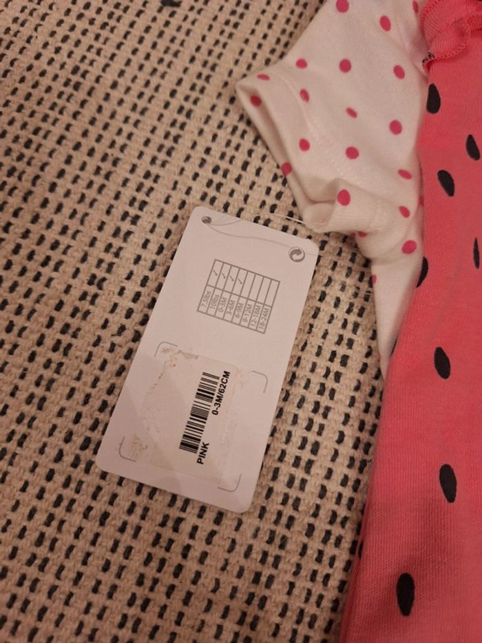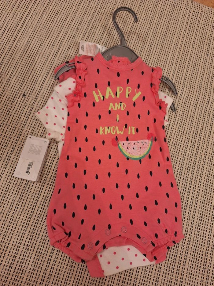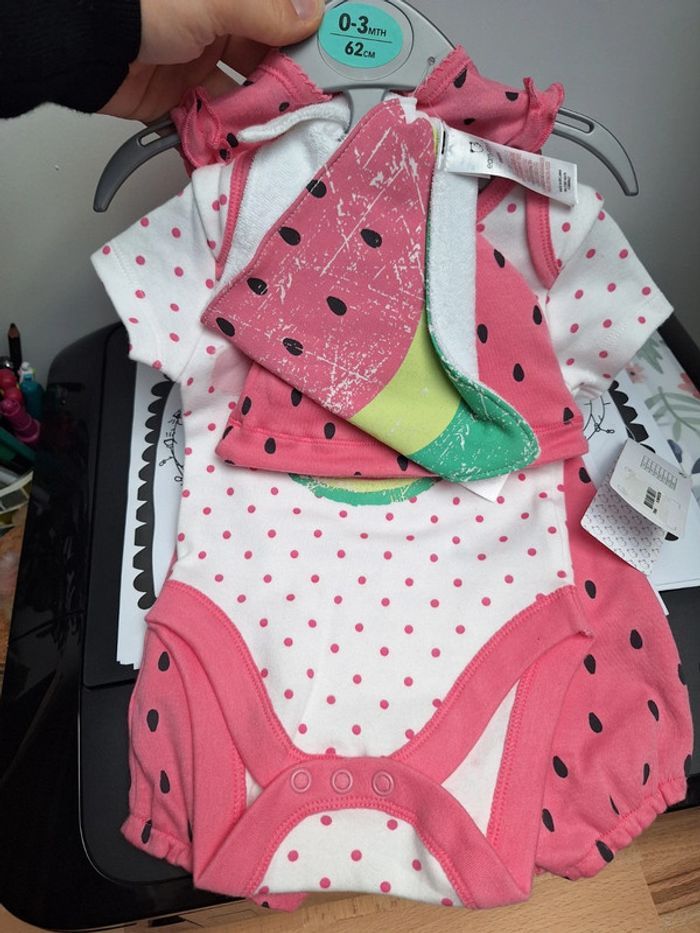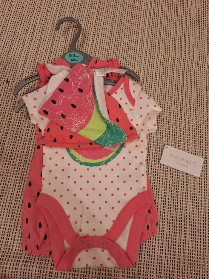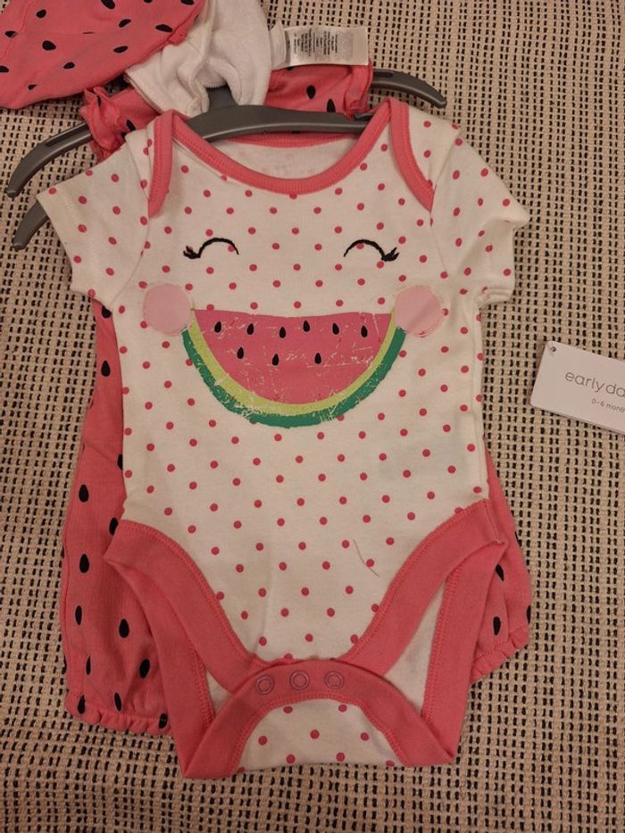 Adorable ensemble de naissance, spécifié 0-3 mois sur l'étiquette, 62cm. Composé d'une barboteuse rose (plus rose en réalité que sur la photo), d'un body, d'un bonnet et d'un bandana. J'ai des chaussons dans mon dressing qui vont avec la tenue si jamais. Parfait pour l'été, tenue pleine de pep's pour une petite fille qui vient d'arriver. J'ai coupé un bout d'étiquette, car je comptais l'offrir à la base, mais la taille ne correspondait pas à la petite fille finalement, car elle est née un plus dodue que prévu, et donc pas à la bonne saison. #ensemble #bébé #body #barboteuse #pastèque #naissance