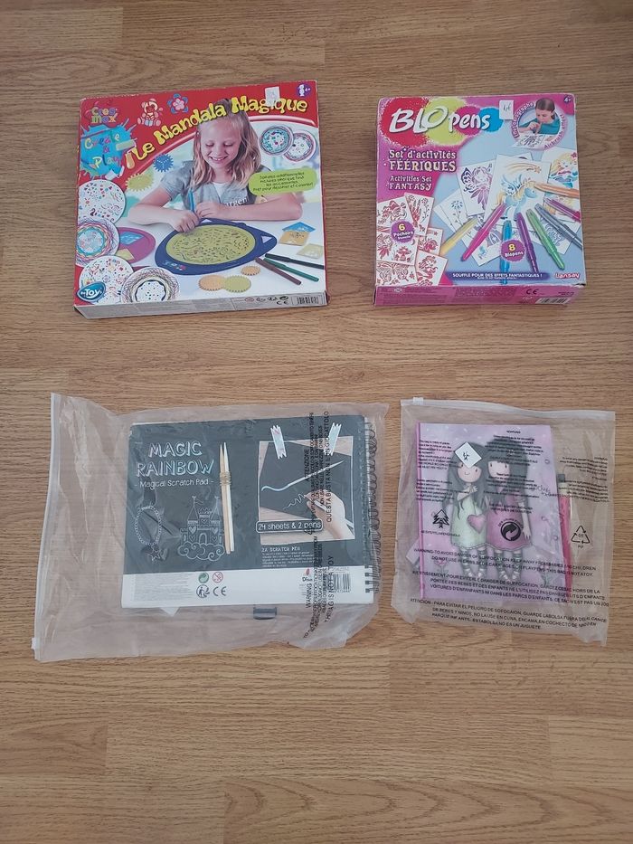 - Coffret Mandala (be toy’s) absence de feutres 5€ - Coffret Blo pens servi (Lansay) 4€ - Livret 20 feuillets magic rainbow + 2 scratch pens 3€ - Coffret livre + règle + gomme + stylo (Santoro gorjuss) correcteur sur la première page 5€