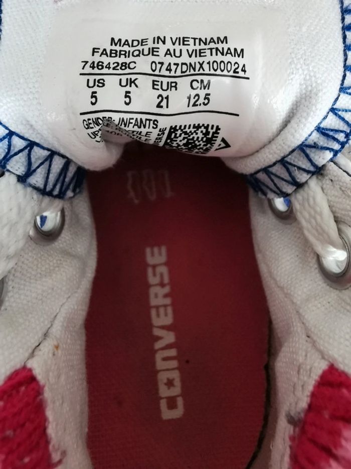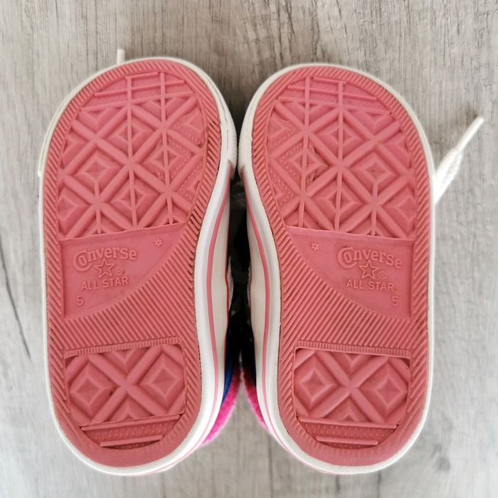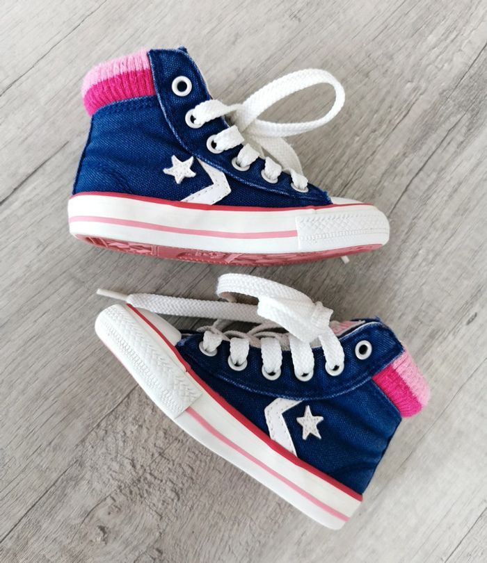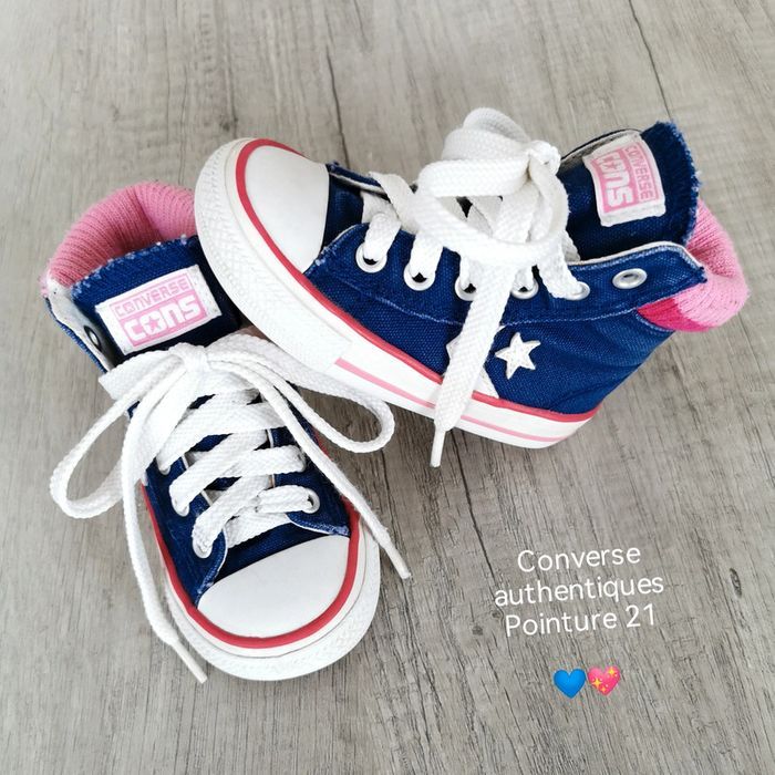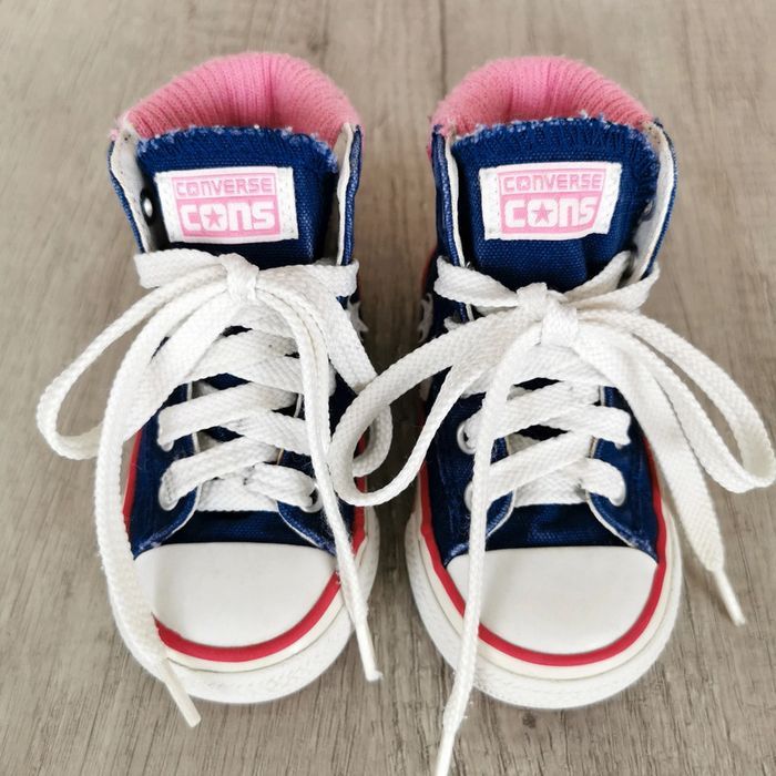 Baskets montantes à lacets Marque Converse (authentiques) Pointure 21 Couleurs : bleu, blanc et rose Propres et en très très bon état, peu portées, aucune tâche, aucun accroc, aucune mauvaise odeur 👍🏻 Quelques bouloches sur les entourages de chevilles