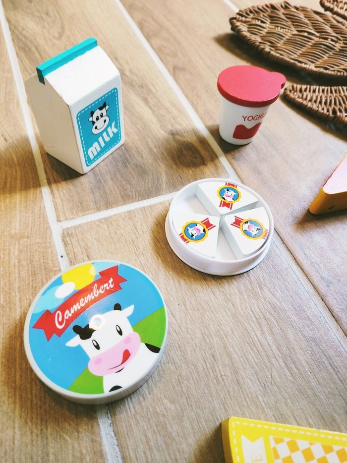 🥛Jeu d'imitation - Dinette en bois produits laitiers et aliments divers