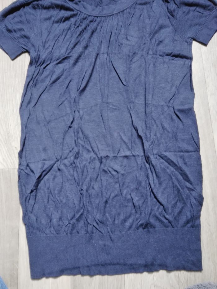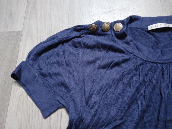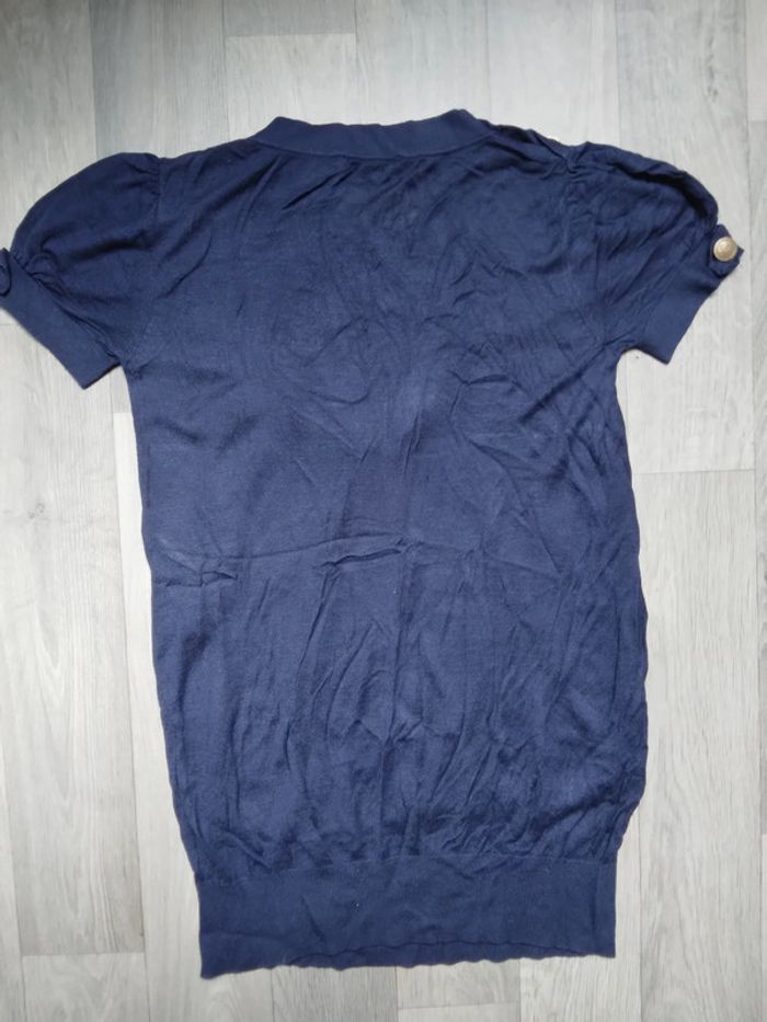 Pull fins long bleu marine manche courte, boutons décoratif sur les épaules, tissu léger, taille 1 (38)