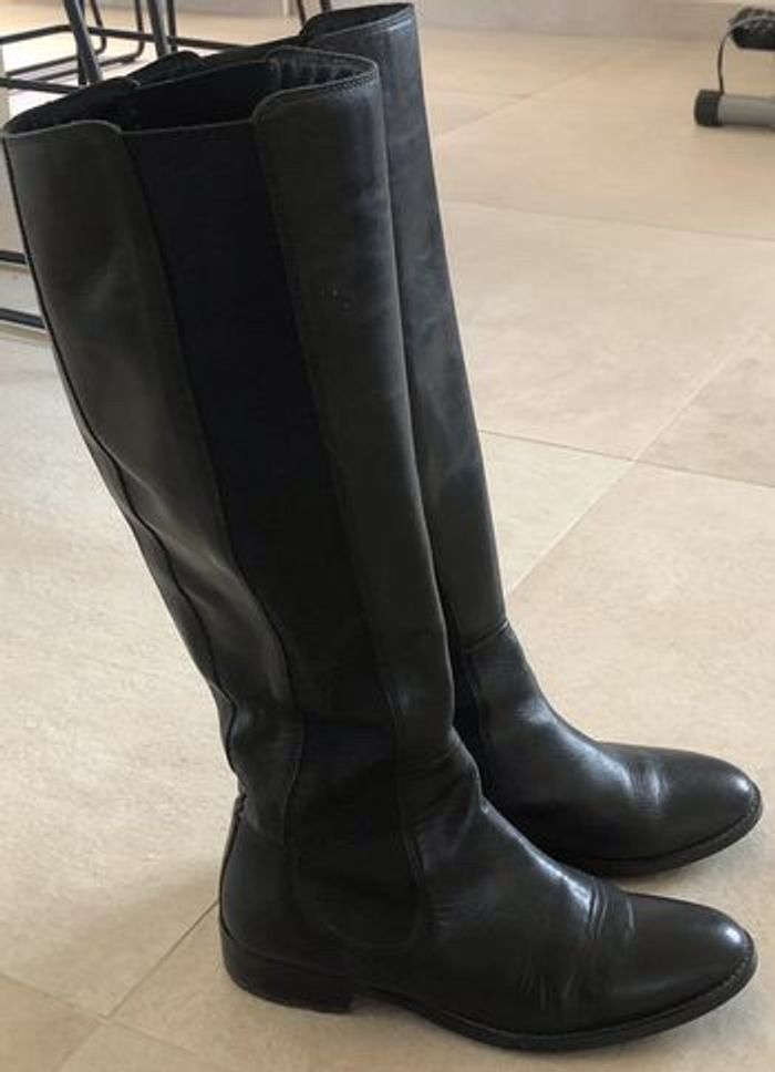 Bottes en cuir noir Style cavalier avec élastique sur les 2 côtés Très belle qualité Très bon état, peu portées Hauteur totale 44cm Talon 3cm Pointure 39 Marque : San Marina Prix boutique 170€