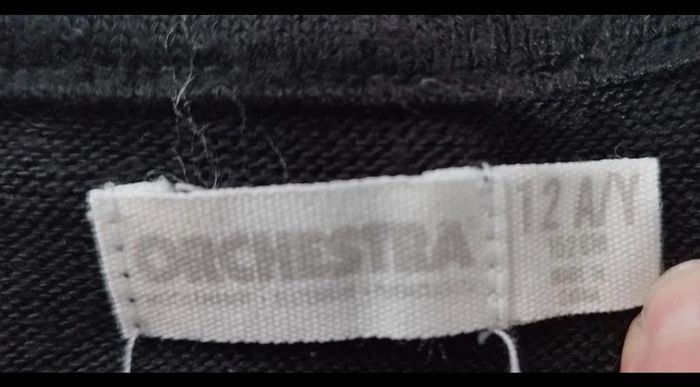 Entre pull et tee shirt, noir avec motifs blancs, roses et dorés, taille plutôt 11 ans pour ma part