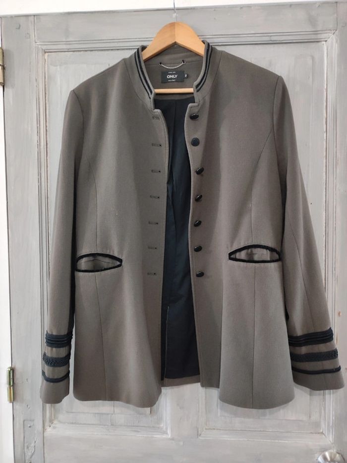 Veste à boutons, couleurs kaki et noir. Col Mao. Mensurations : Épaule à épaule : 42cm - Largeur : 49cm - Longueur : 71cm Taille 42 ONLY Très bon état