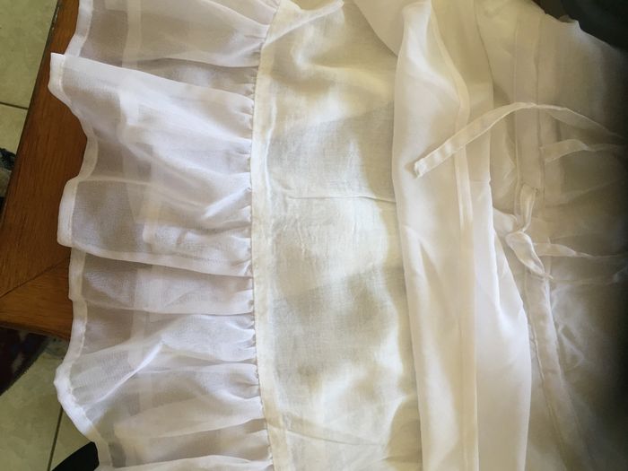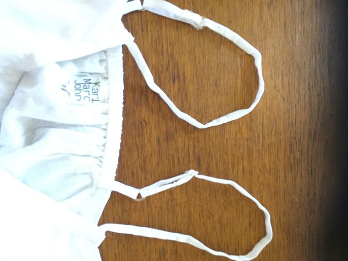 Top blanc dos-nu, Karl Marc John, taille 38-M, largeur aisselles 44 cm, longueur sans les bretelles 60 cm, bretelles réglables, lien de serrage taille, ouverture devant 5 boutons, entièrement doublée, 100% polyester - TBE