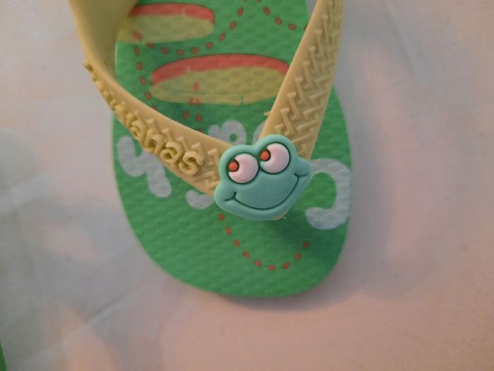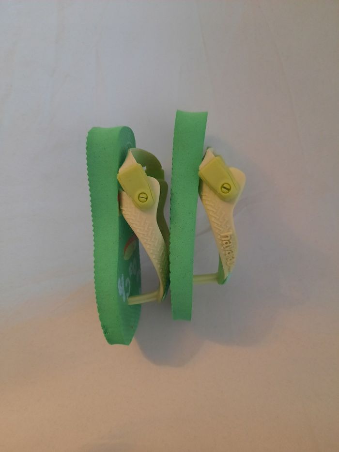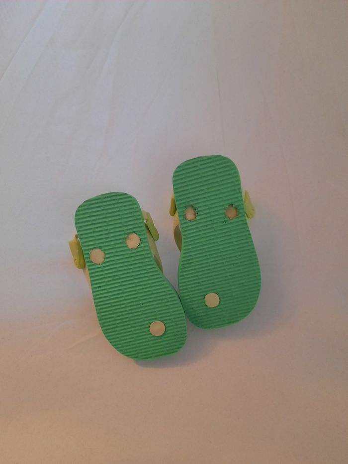 Bonjour, Vends tongues vertes avec têtes de grenouille en taille 19. Bon état général, élastique à l'arrière pour maintenir le pied de bébé Pour toutes questions n'hésitez pas à me contacter