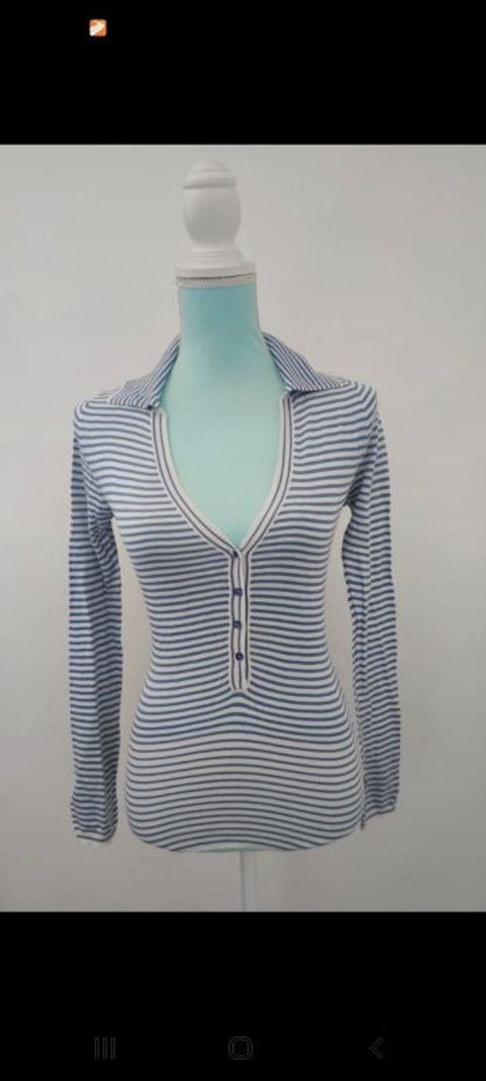 🌹 Joli pull rayé style marinière, il est léger agréable à porter, un grand col en V. 🌹 Porté 1 fois 🌹 Marque : Adolfo Dominguez 🌹 Taille 34