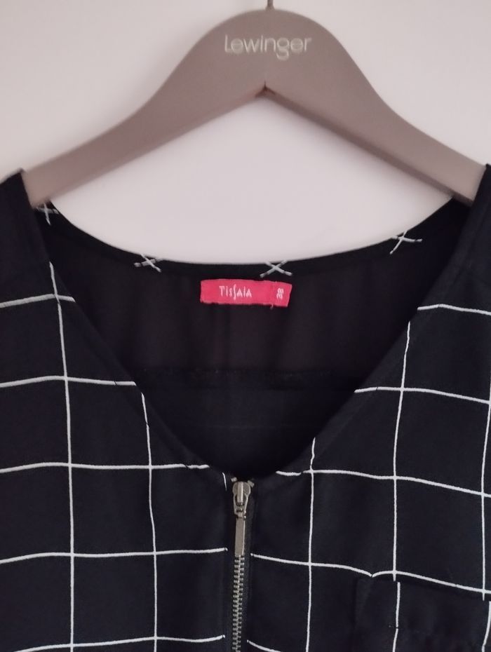 Robe femme de la marque Tissaia. C'est une taille 38. Elle est noire avec des rayures blanches Elle est noire au niveau des épaules et en haut du dos. Elle a une fermeture éclair au niveau du col. Il y a une poche à gauche sur le devant. Elle a des manches très courtes. C'est une robe fluide mais elle est doublée. Je n'ai pas d'information sur la composition car l'étiquette a été découpée. Elle est en très bon état.